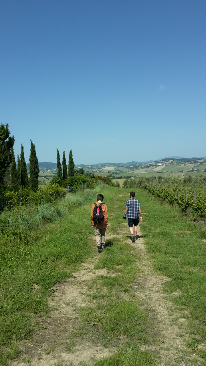 Nel frattempo entra Timo, che da qualche anno fa il benzinaio. Alcuni forse ricordano il suo piccolo negozio di dischi a Senigallia, molto speciale, diversi anni fa, una fessura verso mondi fatti di sintetizzatori, artisti sperimentatori; una strada laterale rispetto alle vie quotidiane, un piccolo folle sentiero nascosto in un vicolo in fondo al corso di Senigallia, che qualcuno ha avuto il privilegio di frequentare. “Non mi parlate di camminate, a me, per favore!” E tira fuori il cellulare con una app contapassi: “Oggi ho fatto quasi venti chilometri e 30.000 passi, guarda.”